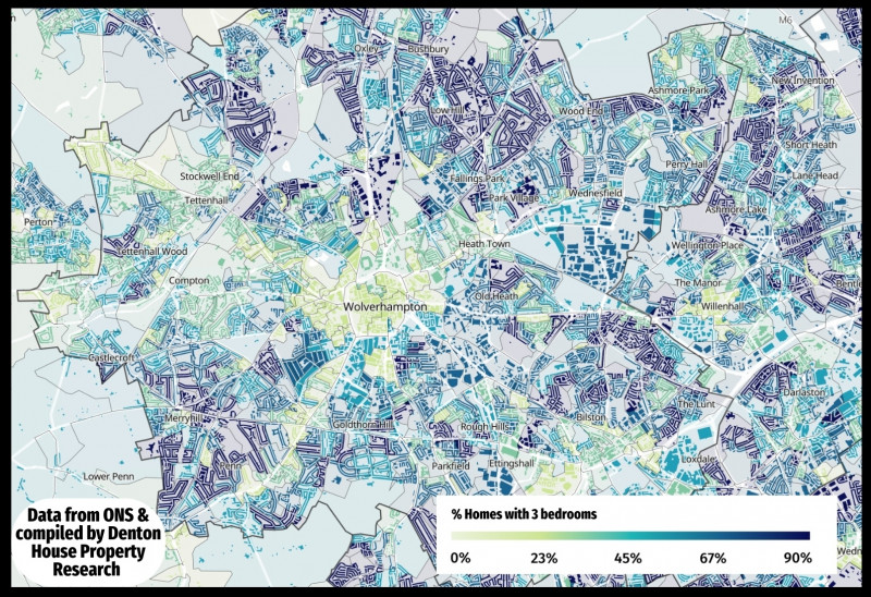 The map above highlights how this plays out locally. The darker blues represent areas with a higher percentage of three-bedroom properties, while the lighter greens show parts of Wolverhampton where they are less common.