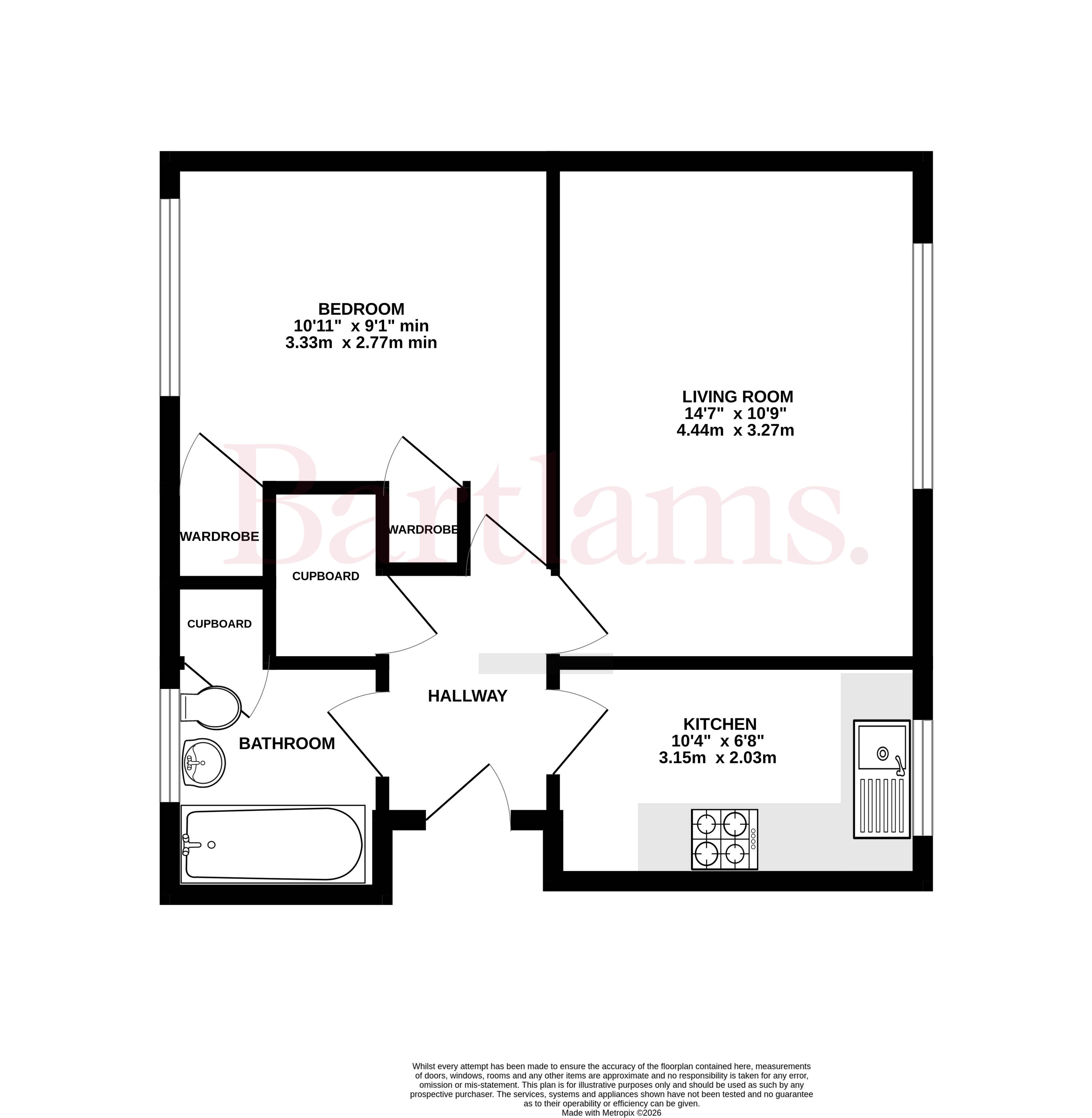 The property features a well-proportioned double bedroom, enhanced by built-in wardrobes that maximise storage without compromising floor space. Completing the accommodation is a bathroom, finished to a contemporary standard and comprising a bath with overhead shower, WC and wash basin.