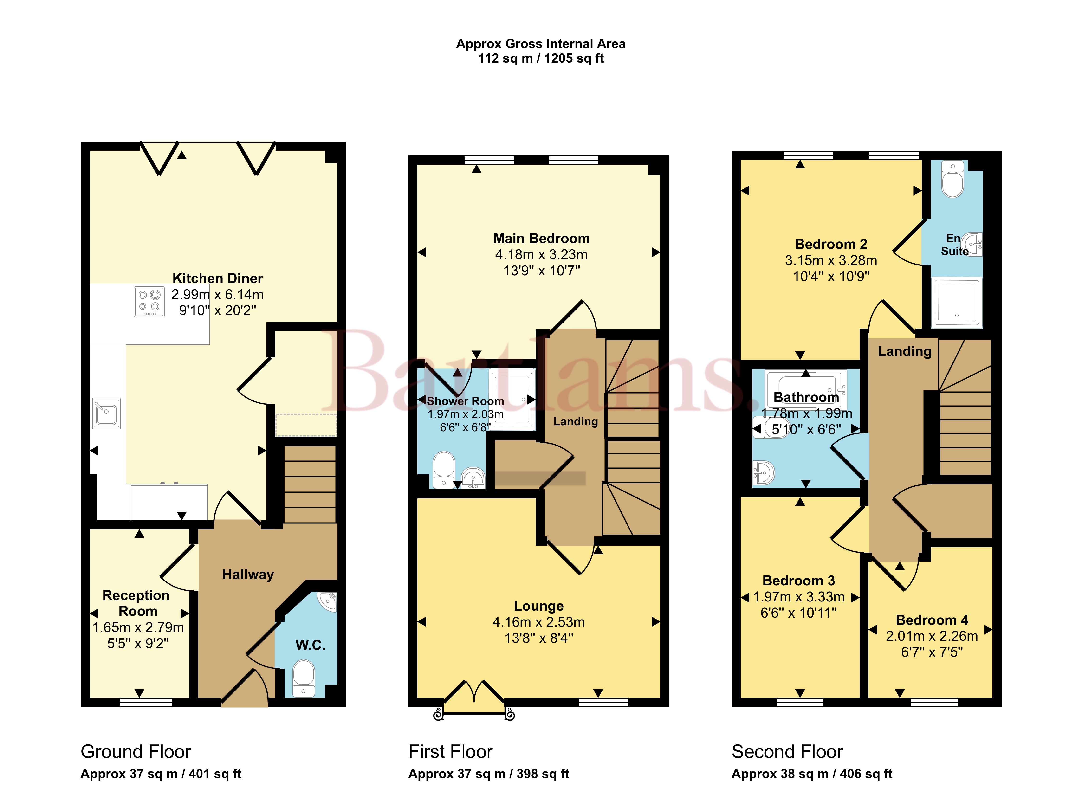 The second floor features two more bedrooms, including the master suite, which enjoys dual-aspect windows and an en-suite bathroom with a shower, WC, and sink. Bedrooms 3 and 4 are positioned at the front of the property and offer ample space, each with large windows that let in plenty of light. The family bathroom is centrally located on this floor, featuring a bath, sink, and WC.