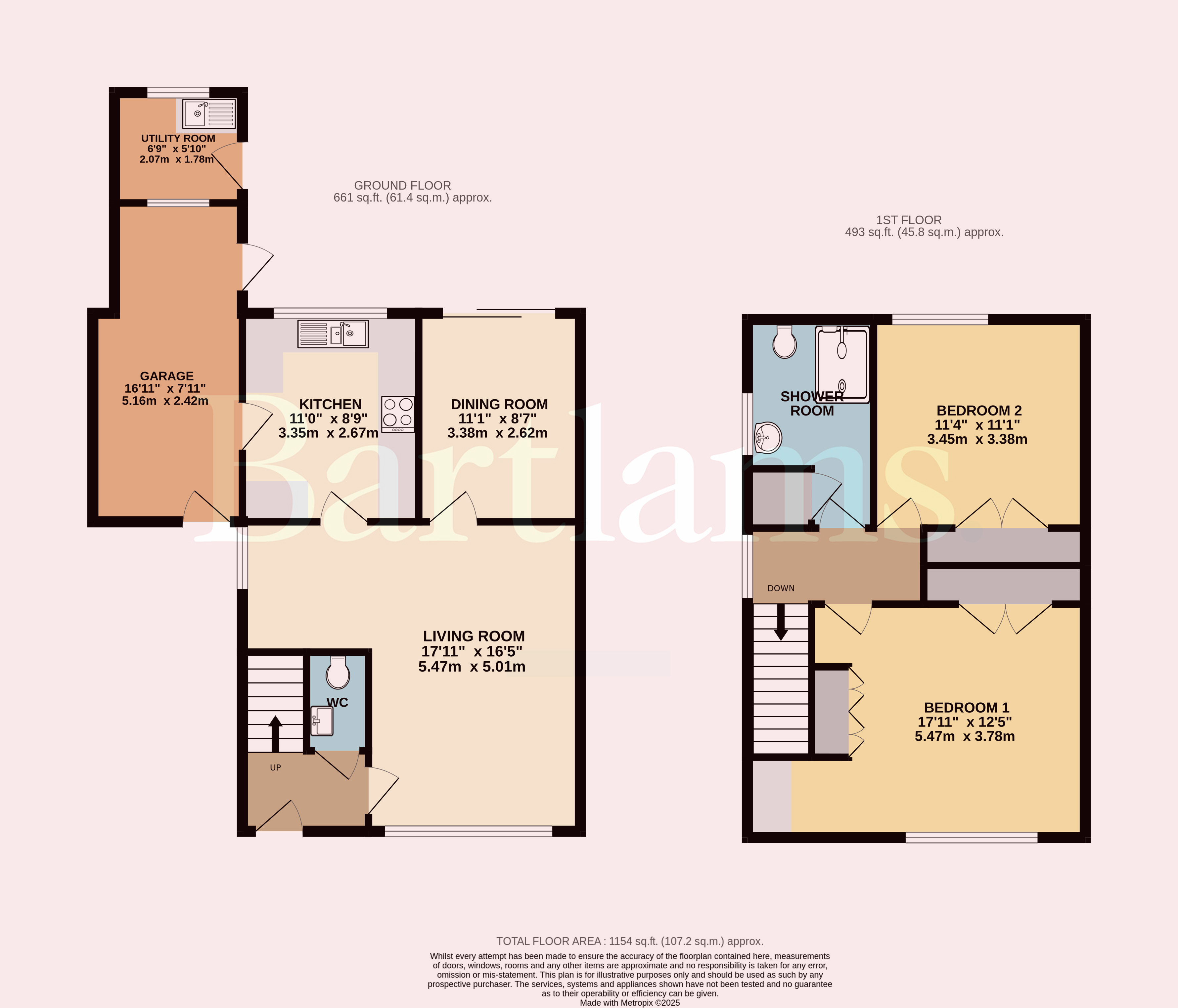 Upstairs, the property features two generous bedrooms. The principal bedroom is positioned to the front and includes built-in wardrobes, while the second double bedroom sits to the rear with built-in wardrobes and pleasant views of the garden. The larger than average family shower room is fitted with an enclosed shower, WC, wash-hand basin and an airing cupboard housing the boiler. The landing benefits from a window for more natural light.