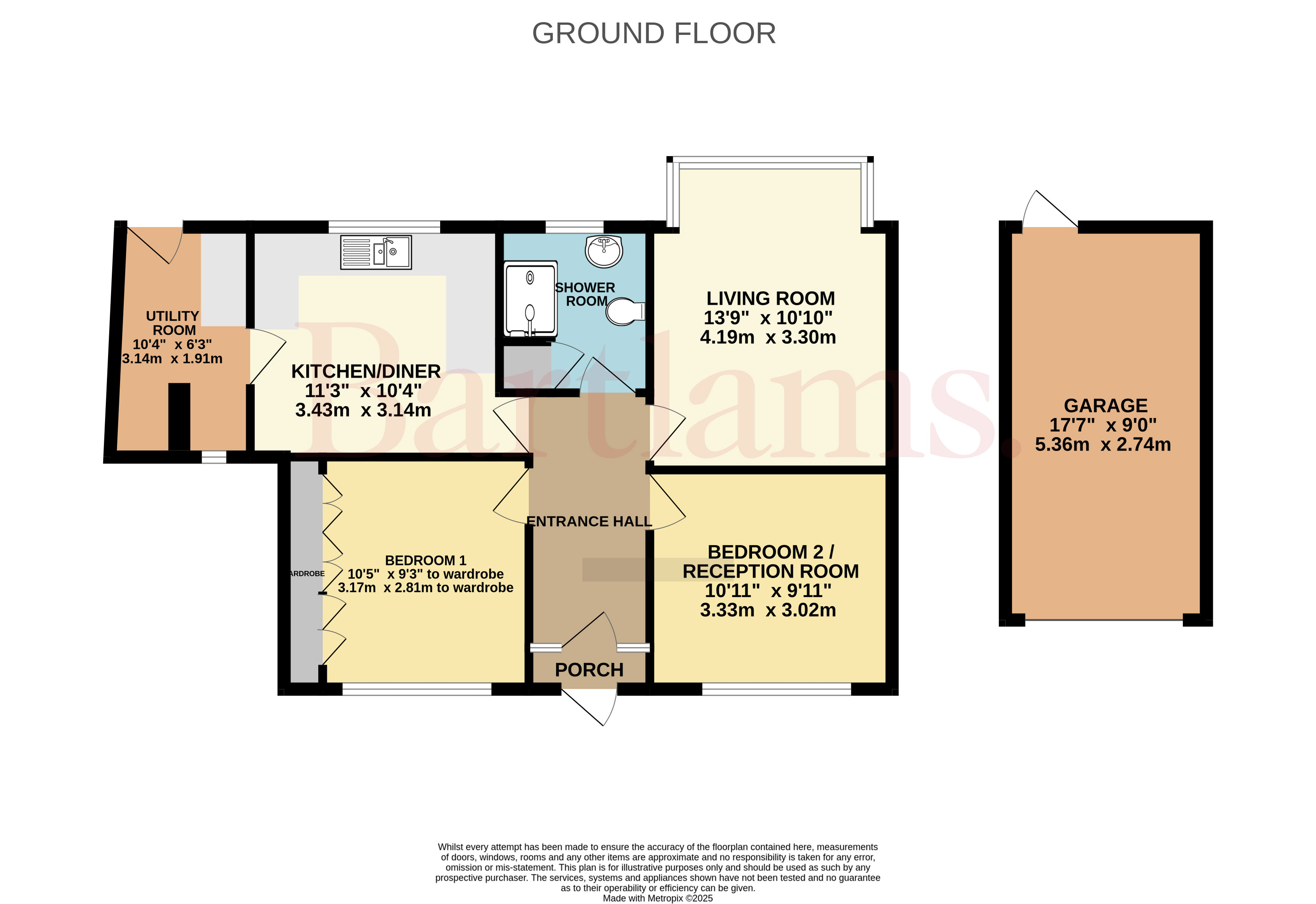 The property features two generous double bedrooms. The main bedroom benefits from a large window that fills the space with natural light and includes fitted wardrobes for convenient storage. The second bedroom, currently used as a dining room, also offers excellent space and enjoys a bright dual-aspect outlook. The stylish shower room is finished to a high standard with a contemporary suite. At the rear of the home is a spacious living room overlooking the garden, creating a relaxing and versatile space. The light-filled kitchen offers ample room for both dining and breakfast seating, and leads into a useful side utility area with plumbing for a washing machine and access to the rear garden. Externally, the property enjoys a generous rear garden with direct access to a detached garage, complete with power, and lighting.