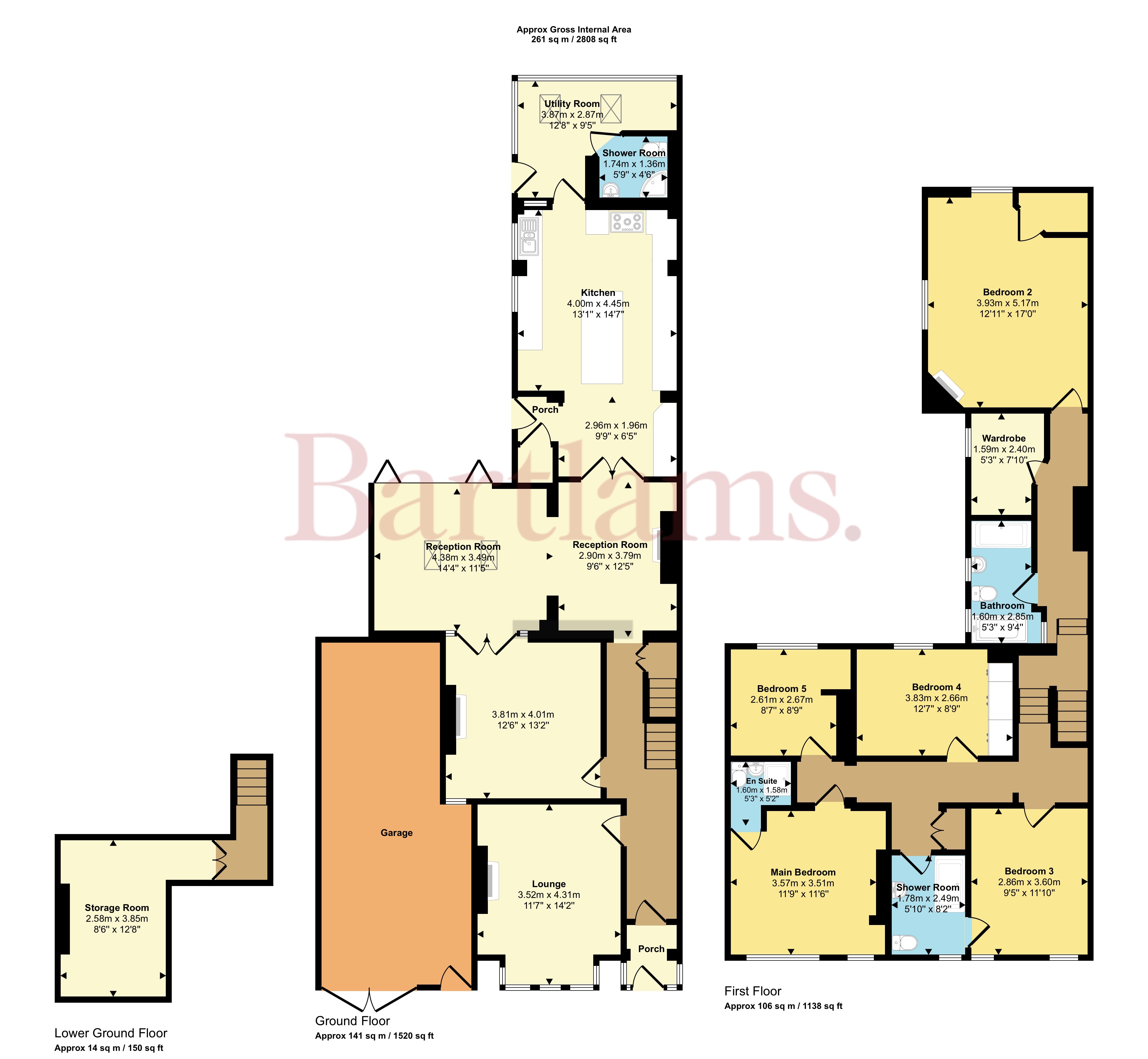 Moving upstairs, the property offers a spacious two-tiered layout with five well-sized bedrooms. The main bedroom is located at the front of the house, featuring dual-aspect windows and an en-suite shower room with WC. Adjacent to the main bedroom is bedroom three, which also benefits from dual-aspect windows overlooking the front of the property. Bedrooms four and five, which are located at the rear, are both generous in size, with windows overlooking the garden and side courtyard. Bedroom four also features fitted wardrobes, making it a practical choice for family members.
