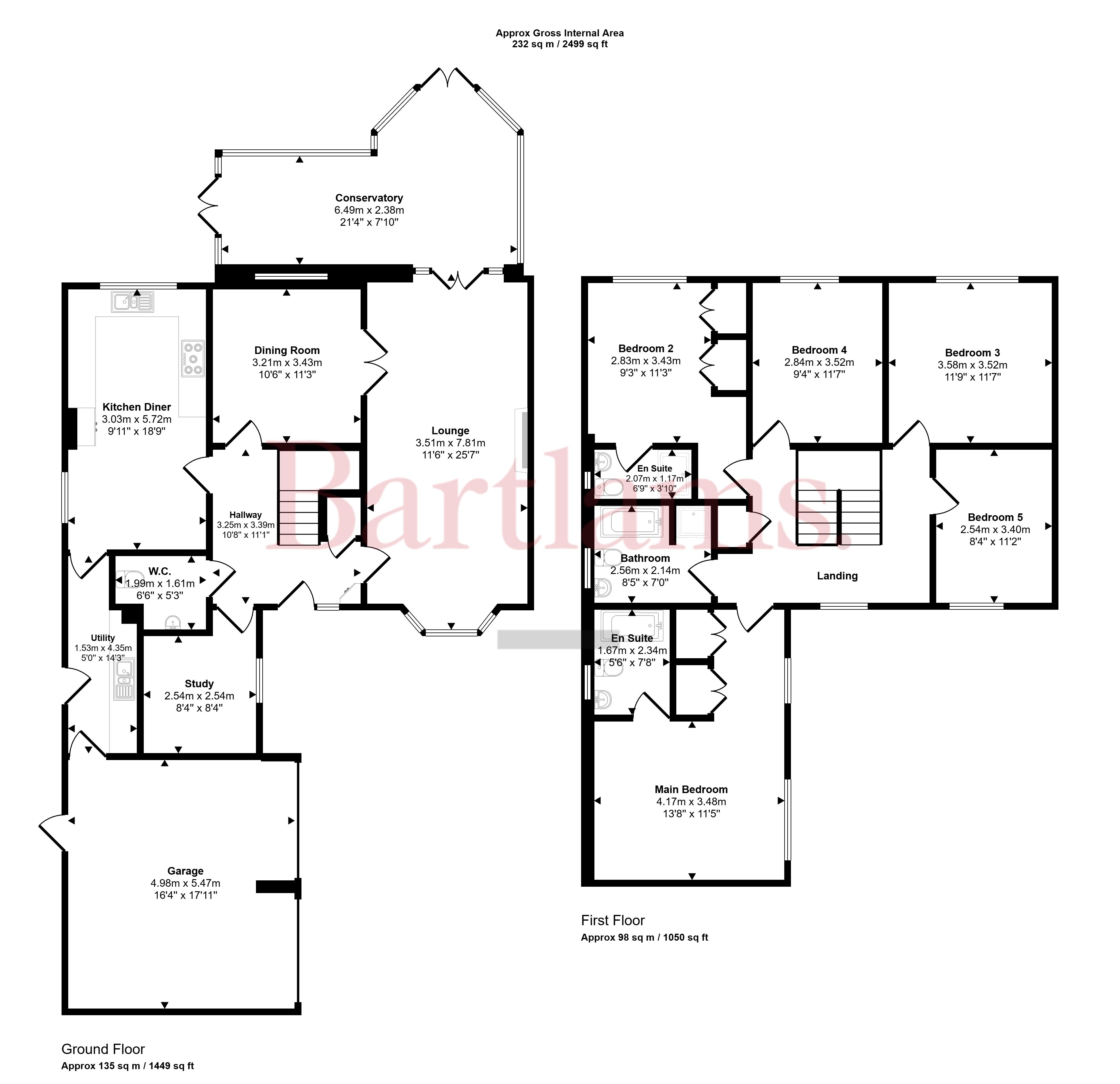 To the first floor, the spacious landing enjoys natural light from a front-facing window and gives access to five bedrooms and the main family bathroom. The principal bedroom benefits from dual-aspect windows and fitted wardrobes. A further large bedroom positioned above the garage also features fitted double wardrobes and a sizeable en-suite bathroom with bath, WC and sink. Bedroom two overlooks the rear garden, includes fitted wardrobes and enjoys its own private en-suite shower room. Bedrooms three and four are also located to the rear, all overlooking the garden, while bedroom five sits to the front of the property. The main family bathroom is well proportioned and fitted with a bath, separate shower, WC and sink, with a frosted side window.