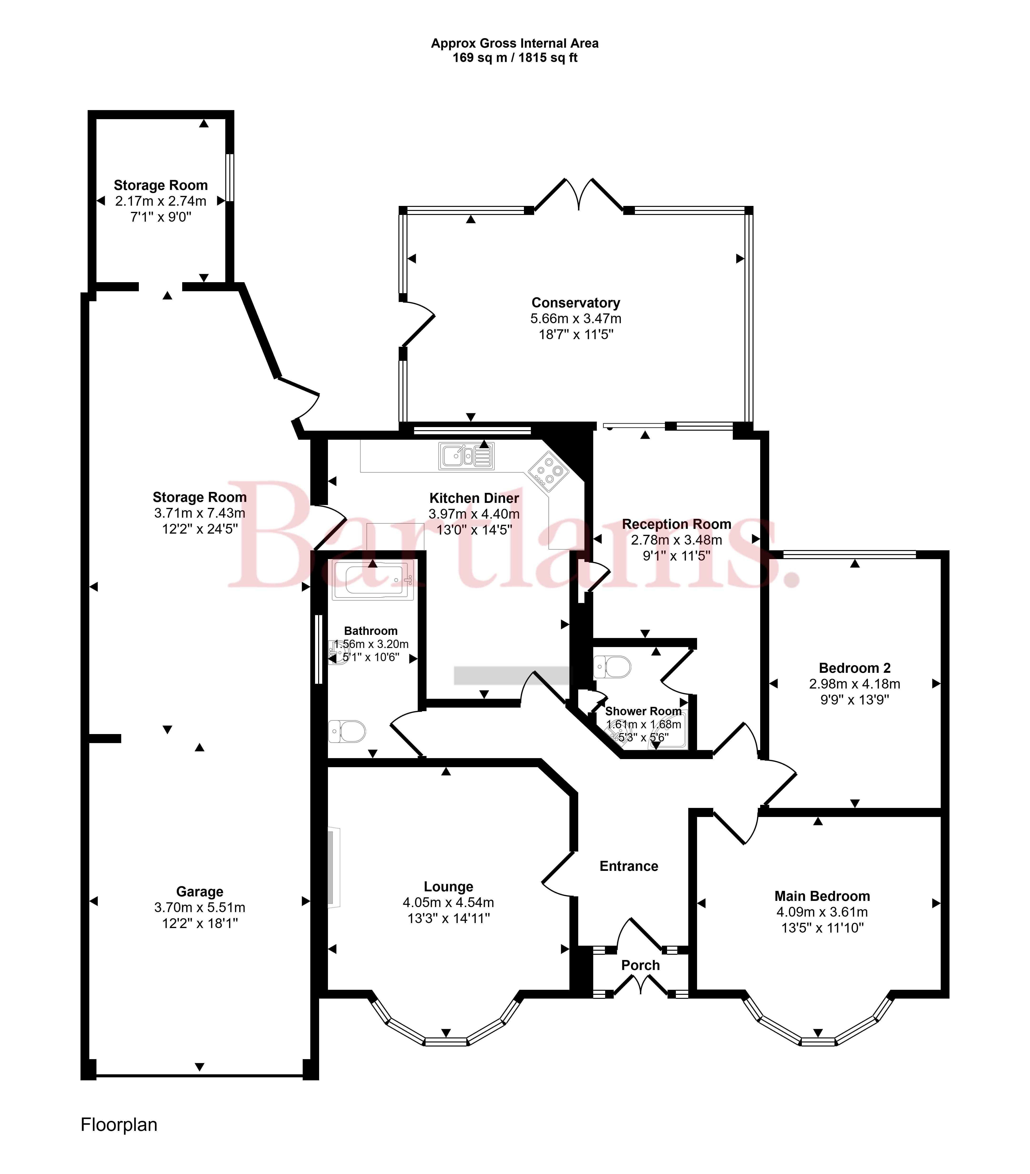 Back through the entrance hall is the main bathroom, fitted with a bath, WC and sink, with a frosted side window looking toward the garage. The L-shaped kitchen diner offers plenty of cupboard and worktop space, with a rear-facing window overlooking the conservatory. From here, you can access the large double-length garage, which runs the full depth of the property and provides substantial storage space, including an additional rear storage area and a door leading directly into the garden.