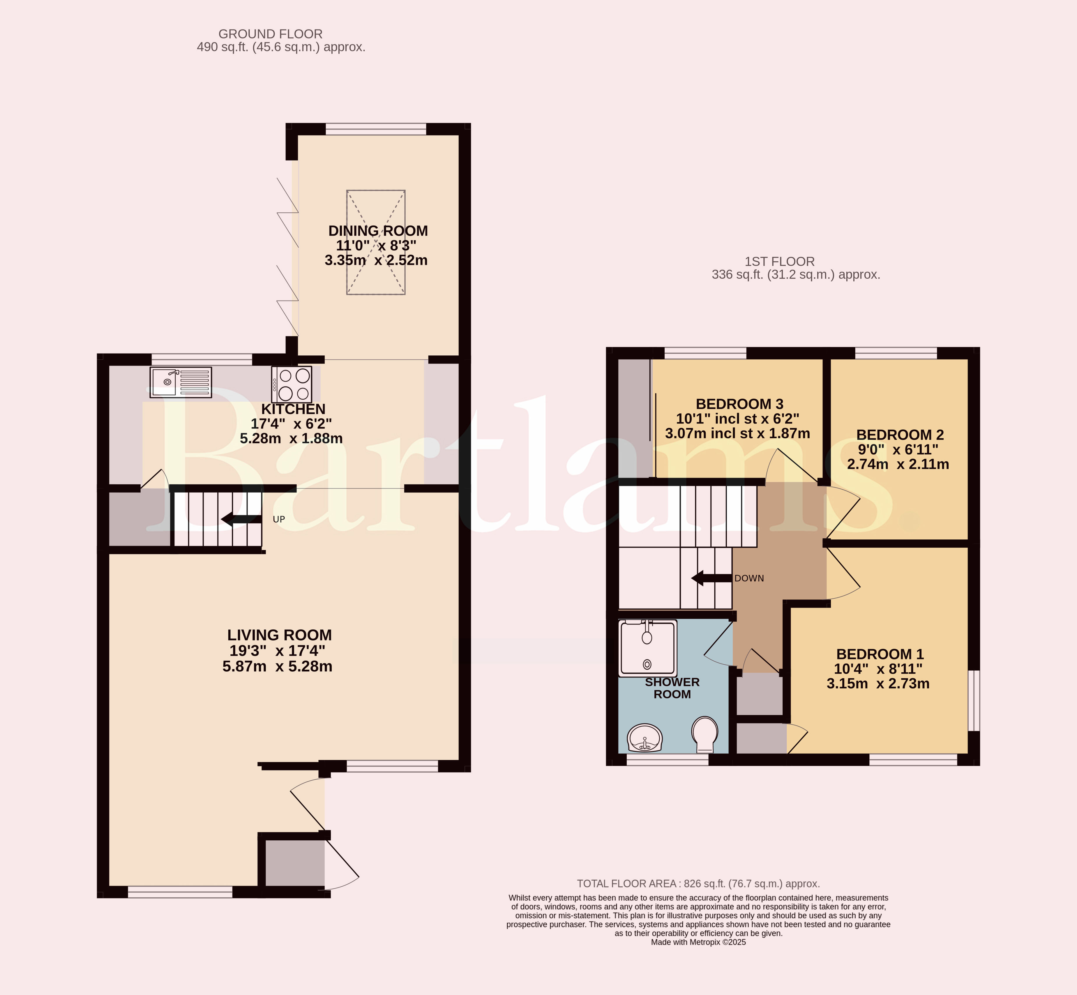 Upstairs, there are three well-proportioned bedrooms. The principal bedroom sits to the front with dual aspect windows and fitted storage, creating a bright and spacious feel. Bedroom two enjoys views of the rear garden, while bedroom three also overlooks the garden and benefits from built-in sliding wardrobes. A stylish family bathroom completes the floor, featuring a walk-in enclosed shower, WC and wash hand basin. The landing itself is generous and includes further built-in storage.