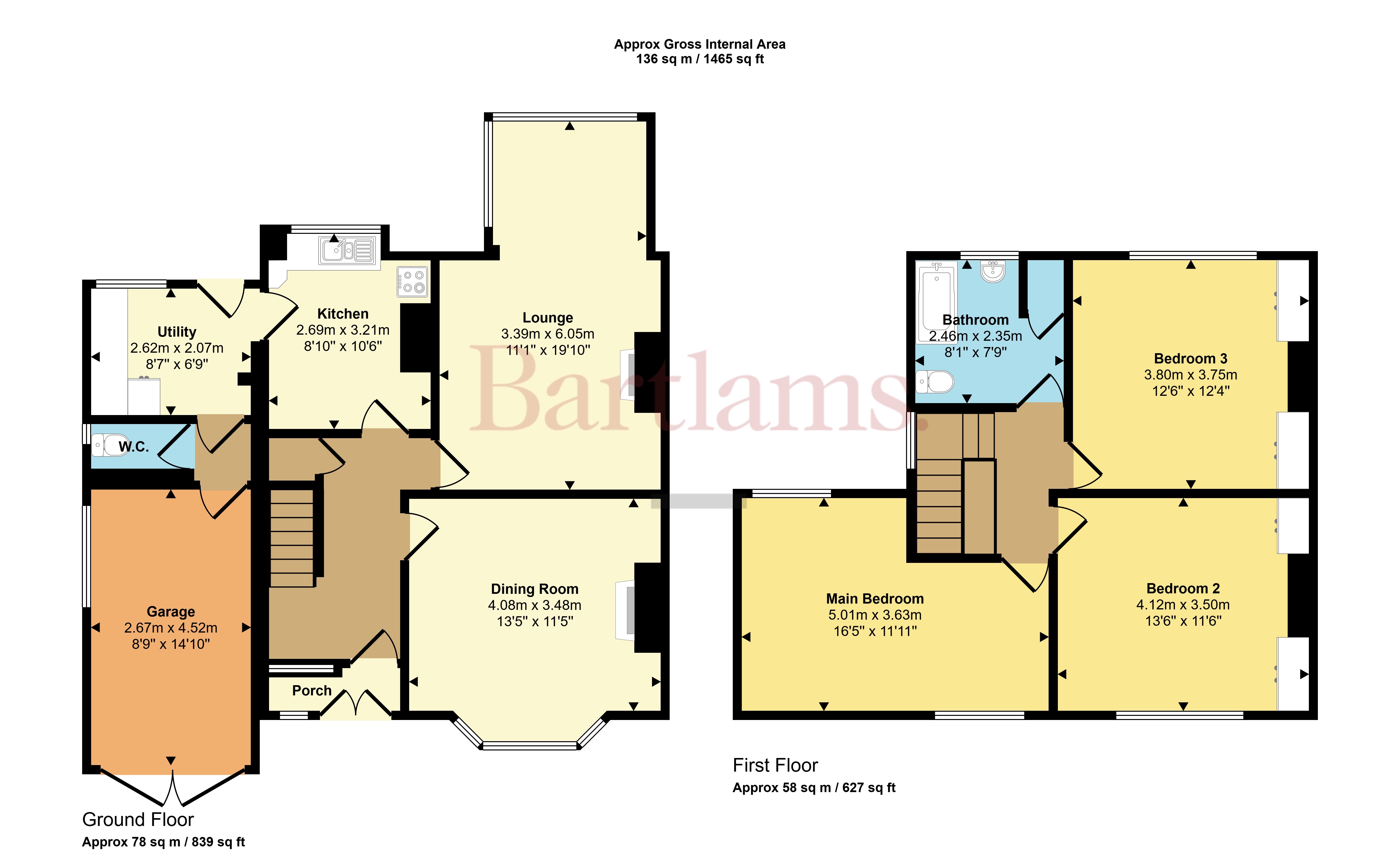 The kitchen provides ample cupboard space, worktops, and a sink beneath the rear window. There's room for casual dining, and from here you’re led into a separate utility room, which includes a side-facing window and rear garden access. Off the utility, there’s a downstairs WC and internal access to the garage, which features working double doors and a large side window.